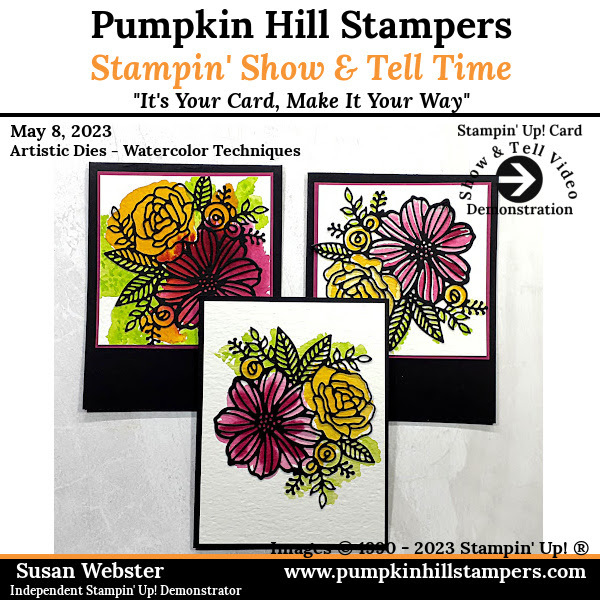 So I was up early one morning last week and really needed to do some watercoloring! I just purchased the Artistic Dies and I decided to work those two ideas together. I created these three projects, each in a slightly different way. I have a Stampin’ Show & Tell video to share that goes through my process for you. Hope you enjoy it!