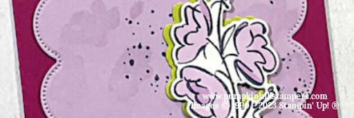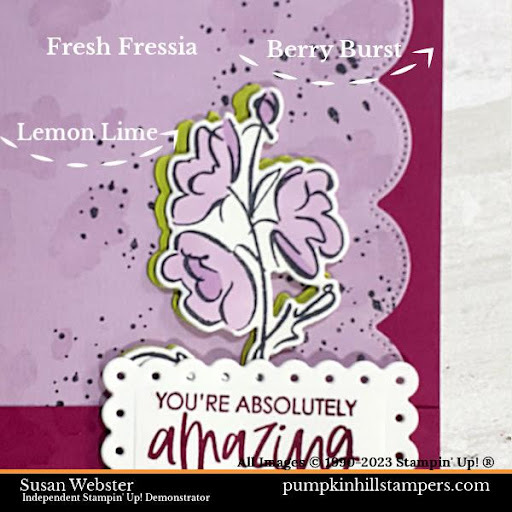 So, Stampin’ Up! has put us through another color refresh with the new 2023-2024 Annual Catalog. My demo team did a color swap so we would have lots of ideas to share with all of you. This is my card that features the Color & Contour stamp set. It also features the recent Fresh Freesia color that moved from an In-Color to our regular color collection. I paired it with Berry Burst which is a returning favorite from a few years past. Then I wanted just a hint of Lemon Lime, so you see it peeking out behind my die-cut flower.